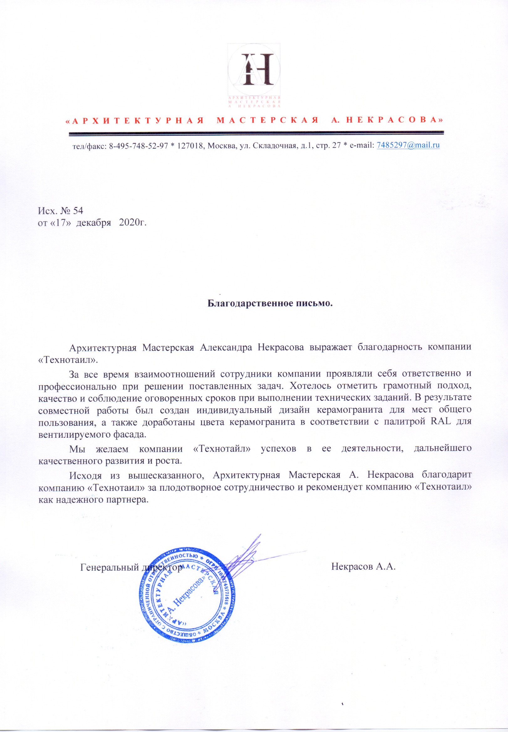 "За все время взаимоотношений сотрудники компании проявили себя ответственно и профессионально при решении поставленных задач. Хотелось отметить грамотный подход, качество и соблюдение оговоренных сроков при выполнении технических заданий. В результате совместной работы был создан индивидуальный дизайн керамогранита для мест общего пользования, а также доработаны цвета керамогранита в соответствии с палитрой RAL для вентилируемого фасада."