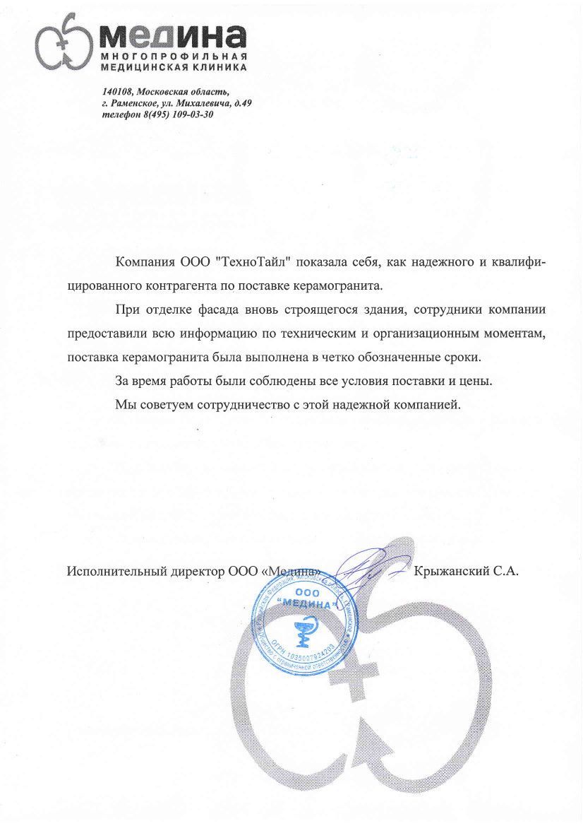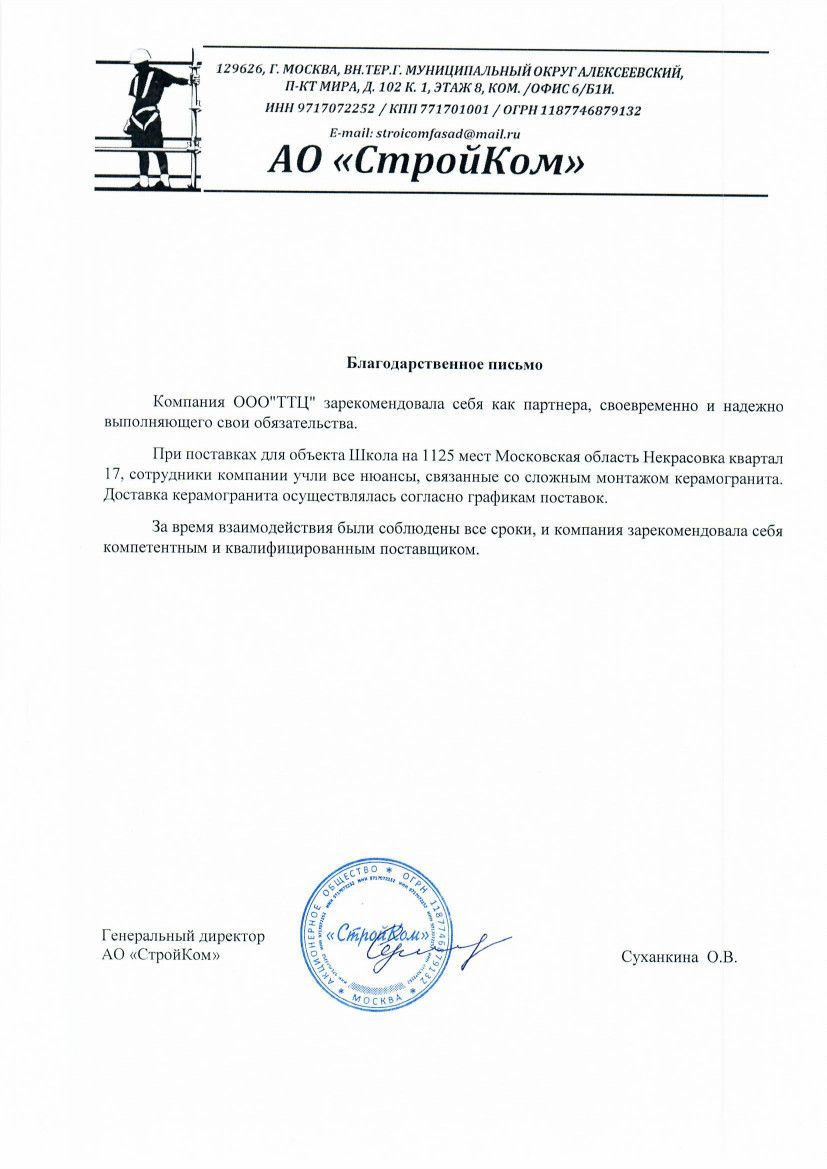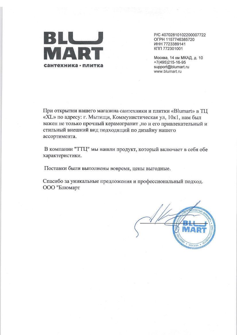 "За период нашей совместной работы Вы проявили себя очень надежным партнером. Высокое качество оказываемых услуг, своевременное выполнение обязательств по договору поставки керамогранита на объект, еще раз убеждает в профессионализме сотрудников компании ООО "ТТЦ"."