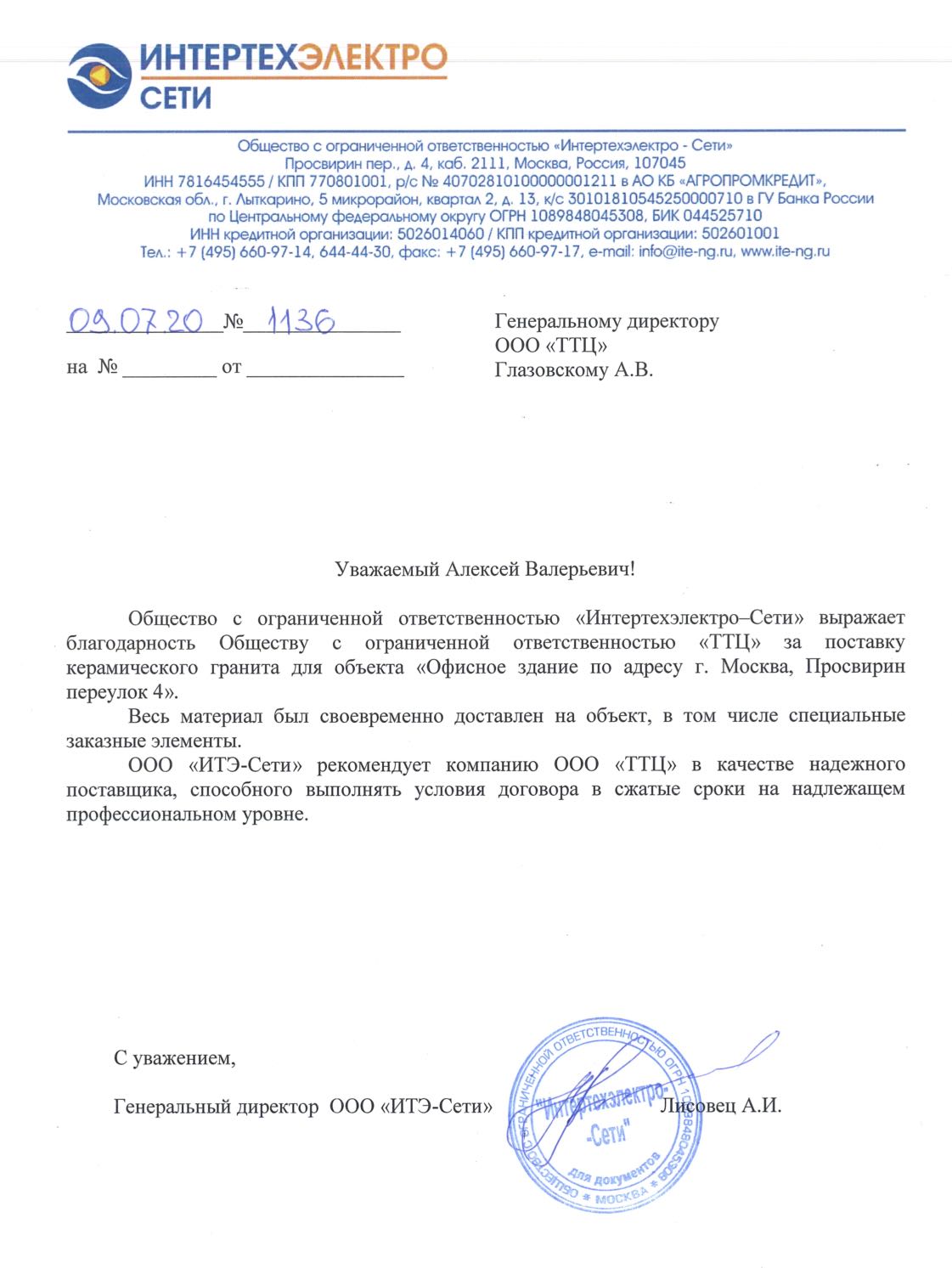 "ООО "ИТЭ-Сети" рекомендует компанию ООО "ТТЦ" в качестве надежного поставщика, способного выполнять условия договора в сжатые сроки на надлежащем профессиональном уровне"
