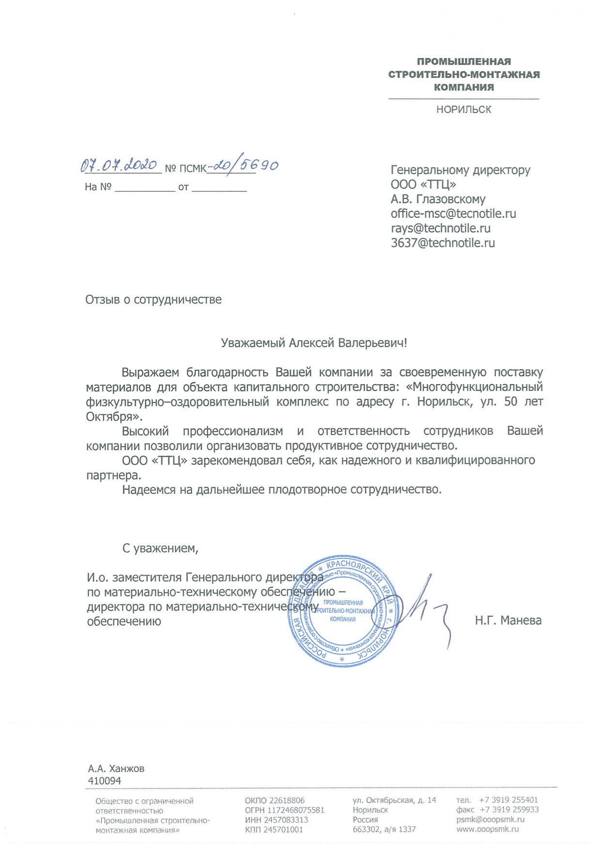 "Высокий профессионализм и ответственность сотрудников Вашей компании позволилил организовать продуктивное сотрудничество. ООО "ТТЦ" зарекомендовал себя, как надежного и квалифицированного партнера."